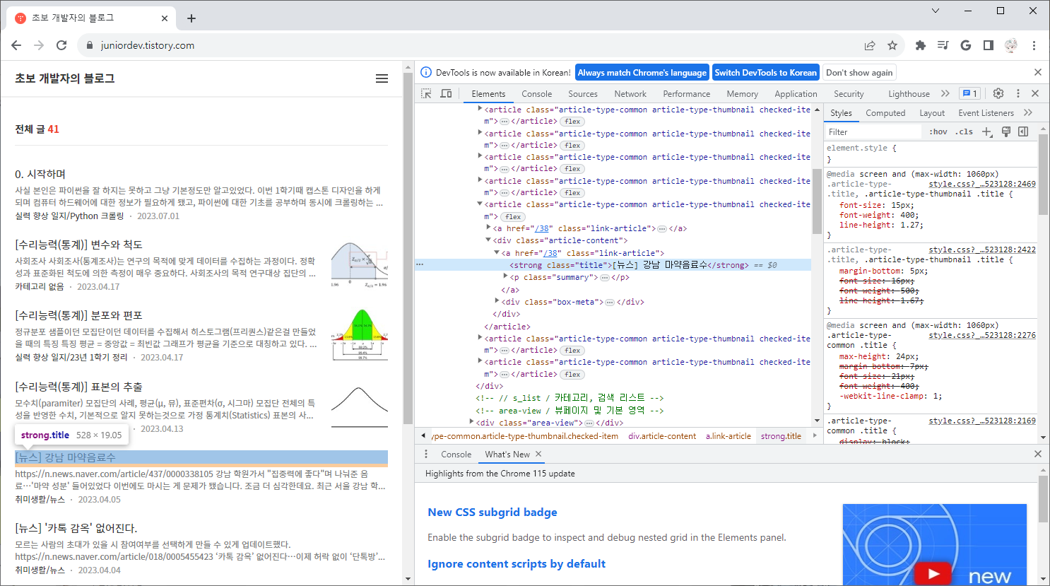 위와같이 strong이라는 태그의 title이라는 클래스 안에 있는걸 알 수 있었다.